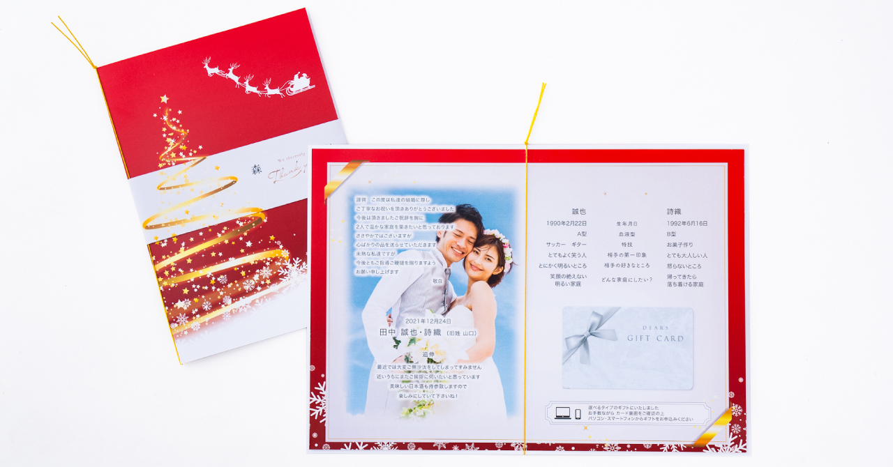 結婚祝いへの感謝の気持ちと共にクリスマスのハッピーな気持ちも届けるデザインです。